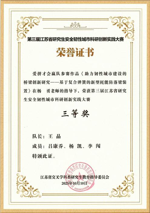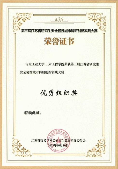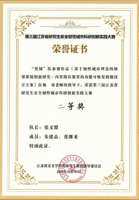 近日,由江苏省交叉学科类研究生教育指导委员会主办,南京大学承办的第三届江苏省研究生安全韧性城市科研创新实践大赛现场决赛在南京大学仙林校区圆满落幕。南京工业大学土木工程学院学子在本次比赛中表现优异,斩获佳绩。在防灾减灾工程系杨勇老师的指导下,由队长张义盟,队员朱建品、张继龙、鲁庆组成的“坚韧队”凭借作品《基于韧性城市理念的桥梁系统创新研究——内置限位装置的功能可恢复桥墩设计方案》荣获二等奖;由队长王晶,队员吕康乔、杨凯、李闯、蒋敬源组成的“爱拼才会赢队”凭借作品《助力韧性城市建设的桥梁创新研究——基于复合弹簧的新型性能防落梁装置》荣获三等奖。此外,南京工业大学土木工程学院凭借出色的组织工作,获评大赛优秀组织奖。